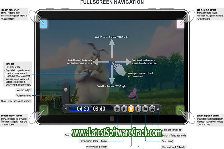. The 5-Key system provides simple & fast navigation while maintaining full access to advanced interfaces such as Media Library, File Browser, Playlist Editor, Color Controls, Audio Equalizer and Bookmarks. Zoom Player’s media center simplicity makes it ideal for users with little or no previous computer experience while at the same time providing power users all the features and options they could ever want in a Fullscreen Navigation Interface.